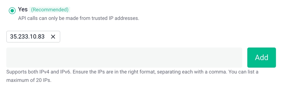 Under the IP Restriction section, click on "Yes" and add the following IP to the list, as follows: